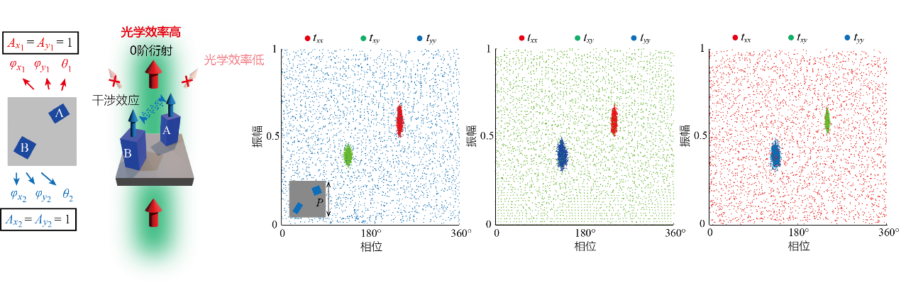 相位、振幅、偏振是单色光场的三个基本自由度。光学器件对单色光场的调控作用可以用一个2×2的琼斯矩阵来表示,琼斯矩阵的每个分量均代表特定偏振态组合的传输系数,由振幅通道和相位通道组成。琼斯矩阵的可控通道数目的多少,不仅标志着光学器件对电磁波的调控能力的强弱,也限制着最终可实现的光学功能的复杂程度。随着现代光学技术的发展,需要光学器件能加载尽可能多的琼斯矩阵通道,以实现诸如偏振切换成像、光学加密、信息编码等复杂光学功能。然而,这些功能有些无法用棱镜、透镜等传统光学器件实现,有些则需要多个传统器件级联,不利于光学系统的小型化、集成化。