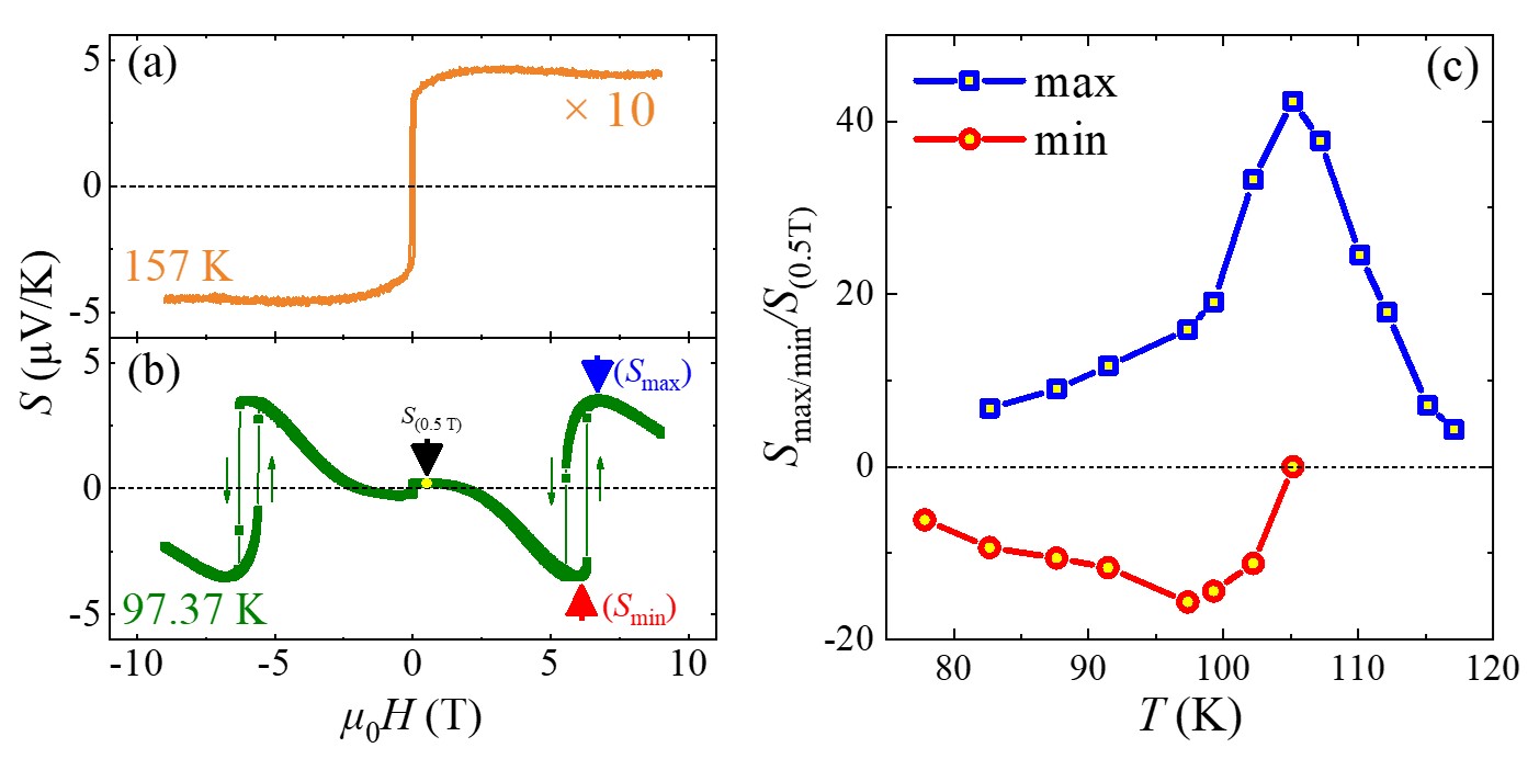 图二、自旋塞贝克系数在不同温度下的磁场依赖关系以及自旋塞贝克放大系数的温度依赖关系
