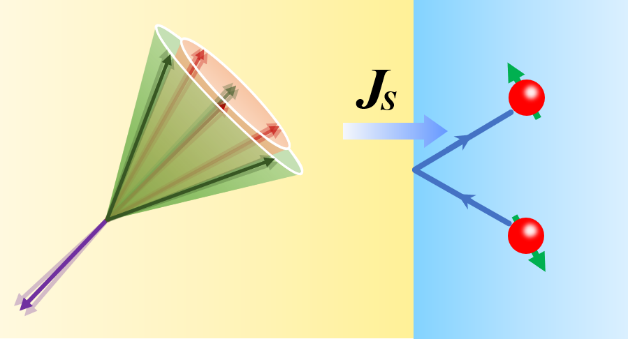 图一、非共线-双伞态磁结构中自旋输运示意图