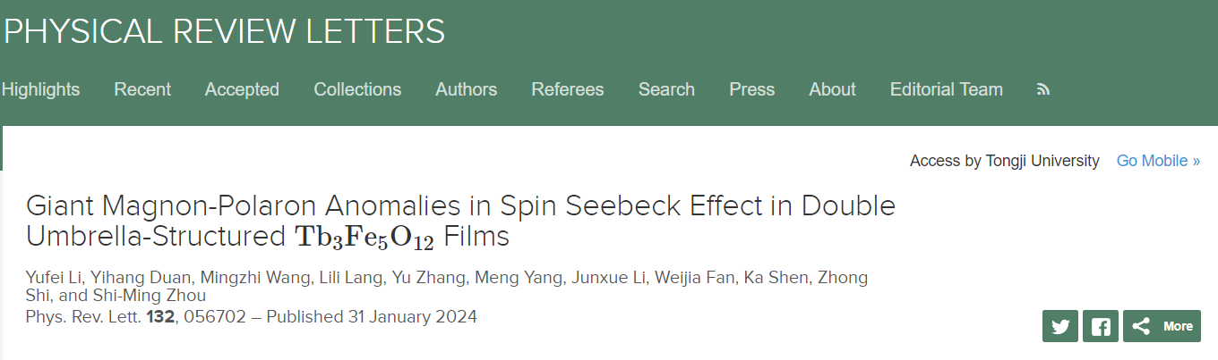近日,242net官网登录入口时钟教授和北京师范大学物理系沈卡教授联合在磁振子输运领域取得新进展,研究成果以“Giant Magnon-Polaron Anomalies in Spin Seebeck Effect in Double Umbrella-Structured Tb3Fe5O12 Films”为题发表在物理学领域顶级期刊《物理评论快报》(Physical Review Letters)上。