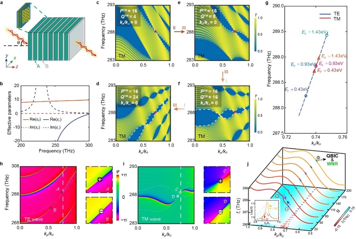 图1:(a–b)在含双曲超构材料的一维光子晶体实现(c–f)旋转自由度和(g)平移自由度。对于(h)TE极化和(i)TM极化,带隙中简并环附近均出现一对具有异号拓扑荷的反射相位奇点,并锚定了双侧鼓面态。(j)增加元胞数N时,奇点对靠近Weyl节点环,形成准连续域束缚态(QBIC)。