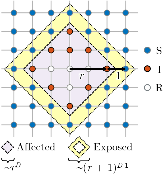 图1:以格子网络为例,传播边界(黄色方框)与传播距离r和网络维度D之间的关系