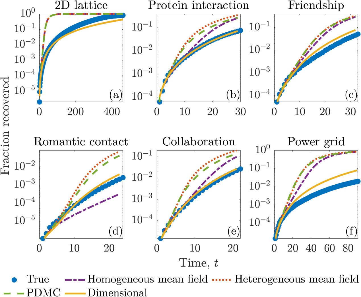 图2:与更复杂的现有模型相比,所提出的网络维度传播模型虽然简单但能更准确地刻画早期传播动态过程。图中展示了不同网络上的实际传播过程(蓝色填充圆圈)以及匀质平均场方法(紫色点虚线)、异质平均场方法(红色点虚线)、概率离散马尔可夫链方法(绿色虚线)和新提出的网络维度传播模型(黄色实线)的估计结果