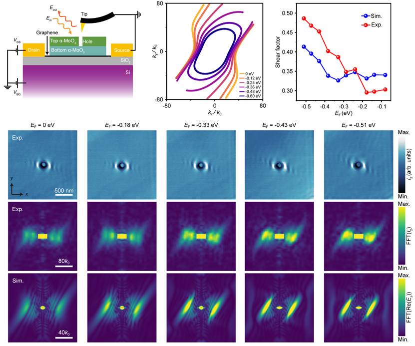 该研究通过构建扭转双层α-MoO3结构,在二维体系中诱导出双曲剪切极化激元,进一步调节层间扭转角度和厚度,可有效控制双曲剪切极化激元的传播方向、能量损耗和局域场强度。结合红外散射型扫描近场光学显微镜表征与全波电磁模拟,研究系统阐明了双曲剪切极化激元的剪切效应及损耗调控机制:扭转角度可增强极化激元的非对称传播特性,实现光信号沿特定方向的高效传输,同时优化局域场分布;调节厚度可进一步丰富传播特性;而通过引入石墨烯的费米能级调控,成功实现对外加电场响应的实时动态调节。