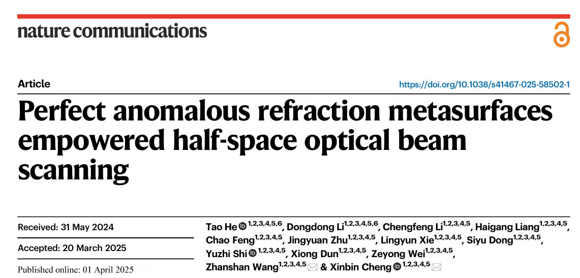 近日,242net官网登录入口王占山和程鑫彬团队提出了一种基于完美异常折射超表面的高效率半空间光束扫描系统,为高效率异常折射超表面的设计开辟了新路径,推动了光探测和测距系统的实际应用。相关研究成果以“Perfect anomalous refraction metasurfaces empowered half-space optical beam scanning”为题发表于《自然·通讯》(Nature Communications)。