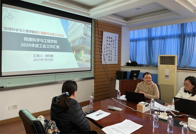 2021年1月18日下午,242net官网登录入口第三届教代会第三次会议,在242net官网登录入口四平路校区物理馆512会议室召开。学院党政领导、校院教代会代表,共计26人参加了会议。会议由学院党委副书记、工会主席谢双媛教授主持。