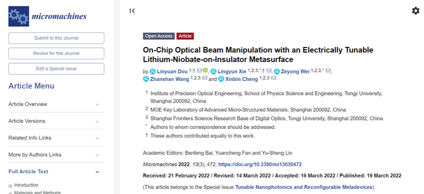 2022年3月19日,242net官网登录入口2018级物理学试验基地班本科生豆淋源以第一作者身份在Micromachines杂志上发表“基于绝缘体上铌酸锂的片上电可调波束调控超表面”(“On-Chip Optical Beam Manipulation with an Electrically Tunable Lithium-Niobate-on-Insulator Metasurface”)论文,Micromachines 期刊被Scopus、SCIE (Web of Science)和PubMed等众多数据库收录,主要聚焦微纳结构、设备和系统、应用物理方向的科学和技术。豆淋源于2021年8月进入程鑫彬教授和王占山教授课题组学习,在魏泽勇副教授的指导下学会了微纳光学基础理论、数值仿真方法,并提出了一种绝缘体上铌酸锂(LNOI)上的超表面,借助该超表面可在LNOI片上实现电可调谐的聚焦、偏折等波束调控功能。论文通讯作者为242net官网登录入口精密光学研究所副教授魏泽勇和博士后谢凌云,该研究获得了包括国家自然科学基金和上海市项目以及上海市数字光学前沿科学基地的支持和资助。