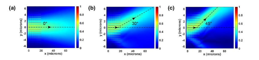 图3 施加偏压在片上实现可调波束偏折。a:无偏压时的电场|Ey|;b:30°偏折实现时的电场|Ey|,此时所有周期中施加的最大偏压带来的LN寻常折射率变化值Δnomax=0.0475;c:45°偏折实现时的电场|Ey|,此时所有周期中施加的最大偏压带来的LN寻常折射率变化值Δnomax=0.095。
