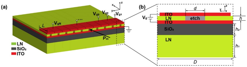 光子集成芯片相较于电子集成芯片有着信息处理和传送更快,且更加安全、高效等优点,或许能够成为下一代信息革命的技术核心。铌酸锂(LN)由于具有众多优异的性质而备受关注,例如宽带光透过性,较大的折射率,很好的非线性系数和优良的电光效应,LN因此成为很好的集成光子学材料选择。豆淋源利用课题组的电磁场仿真软件Gallop,设计了一种电可调LNOI片上超表面。该超表面由19个周期构成,每个周期正中央有一条长20μm的矩形刻槽,周期宽度为700nm,因而整个器件的宽度不超过15μm,整体结构示意图和横截面如图1所示。