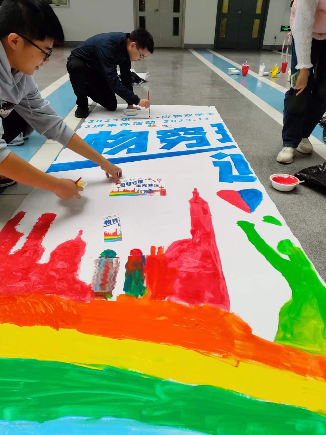 两个小游戏热身之后,同学们开始共同绘制代表着济勤2班“格物穷理,追光致远”精神的巨画。组内、组间同学充分沟通,共同调制颜料,分析图案构型,并充分发挥想象力适当调整画面内容、添加新的图案,使画布充分展现济勤2班学子的个性与风采。最终四个部分拼在一起形成完整的巨画时,面对这幅由所有人的努力凝聚成的艺术品,成就感油然而生,会心的笑容洋溢在每位同学的脸上。