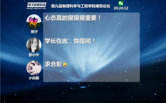 第九届242net官网登录入口博思论坛于11月19日晚18:30在物理馆212室隆重举行,邀请的嘉宾有老师杜艾、博士生朱智超、硕士生武英杰、本科生冯禹。