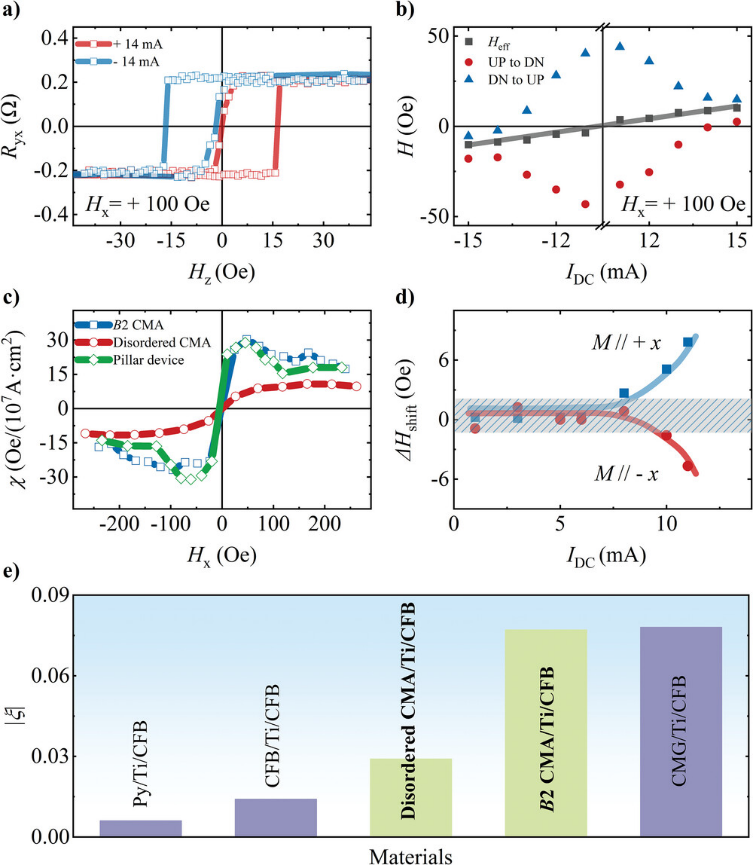 近日,242net官网登录入口磁性薄膜研究团队在铁磁性哈斯勒合金的自旋流产生机制研究中取得重要进展,研究成果以“Large Spin Hall Efficiency and Current-Induced Magnetization Switching in Ferromagnetic Heusler Alloy Co2MnAl-Based Magnetic Trilayers”为题,发表于《先进科学》(Advanced Science)。