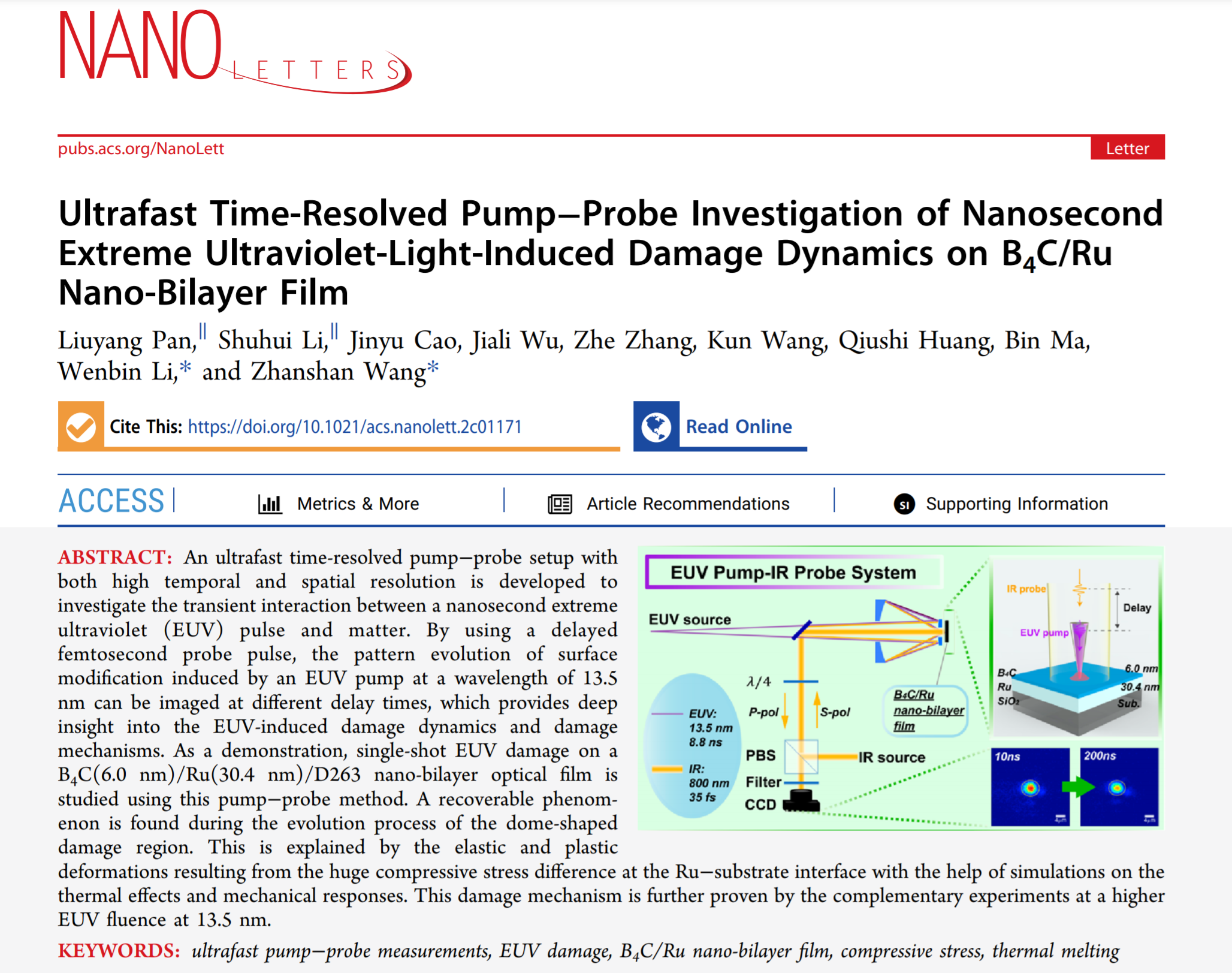 近日,242net官网登录入口李文斌教授和王占山教授团队在《纳米快报》(Nano Letters)上在线发表了题为《B4C/Ru纳米双层膜纳秒极紫外光诱导损伤动力学超快时间分辨泵浦-探测研究》(Ultrafast time-resolved pump-probe investigation of nanosecond extreme ultraviolet light induced damage dynamics on B4C/Ru nano-bilayer film)的论文。该论文首次建立了高时间和空间分辨纳秒极紫外泵浦-飞秒红外激光探测成像损伤测试系统,并利用该系统研究了B4C/Ru纳米双层膜反射镜的极紫外损伤动力学过程,揭示了极紫外辐照损伤区存在自我恢复的现象。