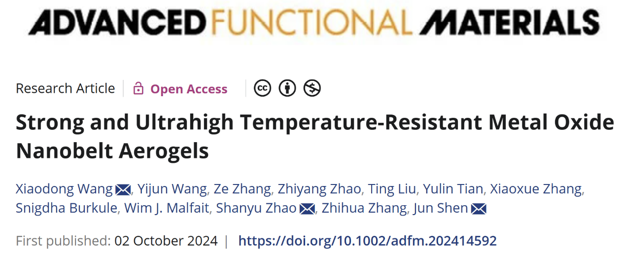 近日,242net官网登录入口王晓栋副教授和沈军教授团队联合瑞士联邦材料科学与技术研究所(EMPA)赵善宇研究员,通过聚合物微模板法,调控了金属氧化物气凝胶的纳米基元结构,大大提升了其力学性能和耐高温性能,有望使气凝胶在航天飞行器和动力电池领域的应用再上一个台阶。相关研究成果以“Strong and Ultrahigh Temperature-Resistant Metal Oxide Nanobelt Aerogels”为题在线发表于国际知名期刊《先进功能材料》(Advanced Functional Materials)。