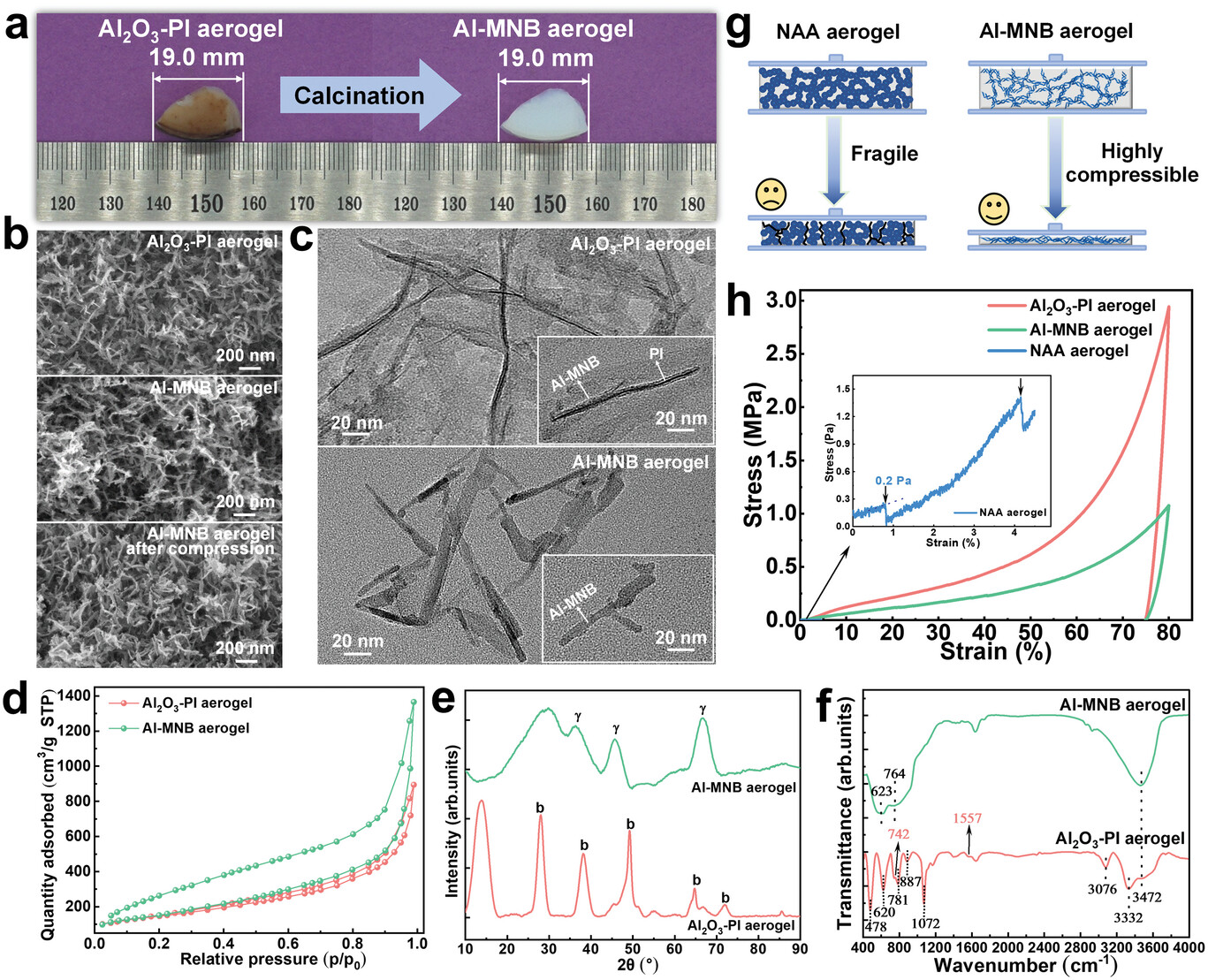 这种一维纳米带基元结构的构筑,避免了纳米颗粒组装的基元结构中的颗粒间节点的形成,减少了应力集中点的同时抑制了高温下的传质和相变,MNB气凝胶因此表现出优异的力学性能和耐高温性能。Al-MNB气凝胶能够承受高达80%的压缩而不碎裂,而传统纳米颗粒组装的氧化铝气凝胶仅能承受4%的压缩。此外,Al-MNB气凝胶在高温实验中表现出优异的耐火性和高温隔热性能,1300°C热处理2小时后仍能保持228m2/g的高比表面积,丁烷喷枪火焰灼烧300s后平均背温仅为68.6°C。