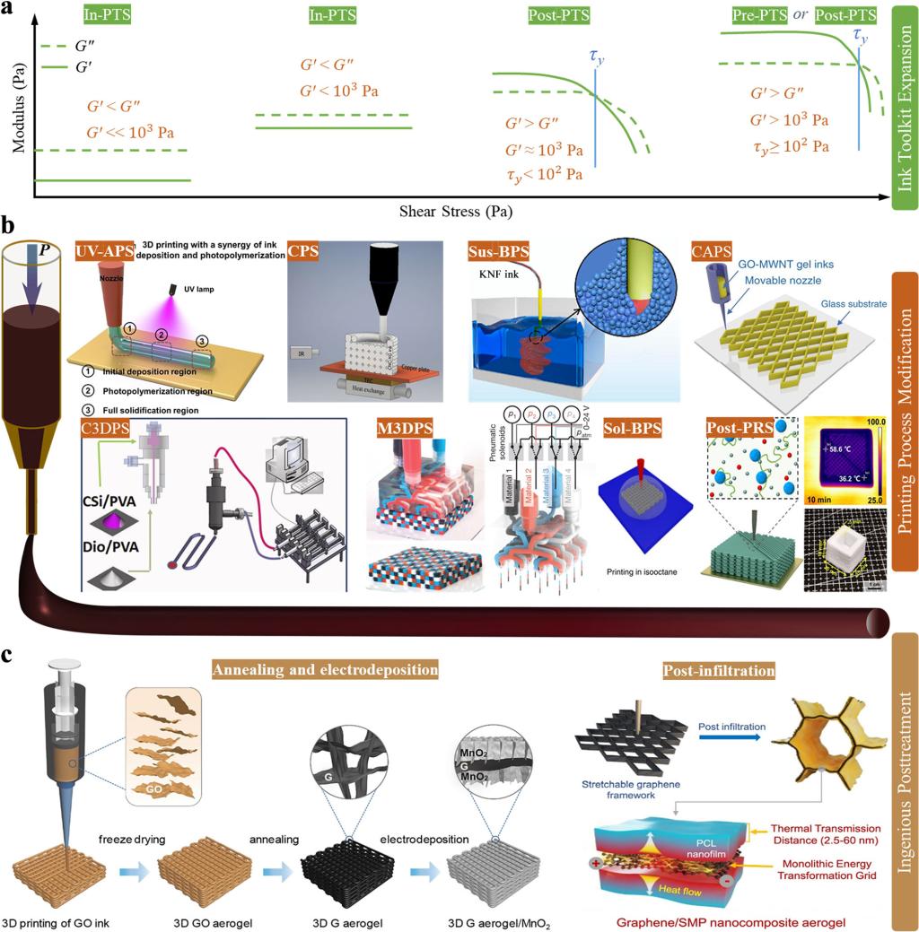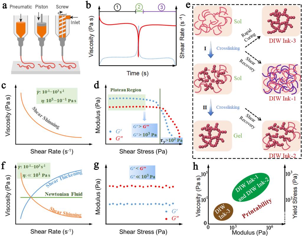为实现气凝胶的直接墨水书写,需优先构建具有剪切-变稀特性的非牛顿流体(图1)。文章通过系统关联气凝胶前驱体流变特性的动态演变与3D打印墨水设计,详细分析了其形成机理,提出了可打印的墨水流变性能判据,为研究人员提供了定性与定量墨水设计的思路。