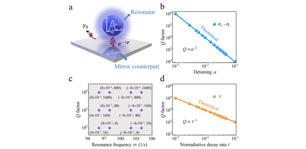 鉴于此,242net官网登录入口王占山和程鑫彬团队联合中国计量科学研究院屈继峰研究员,提出了一种层间耦合谐振子模型(图1a),从理论上严格推导了FP-BICs在微扰作用下的Q因子的演化规律,揭示了Q因子与相位失谐和频率失谐的平方成反比(图1b),同时又和非辐射衰减率成反比的理论规律(图1d),从而实现了FP-BICs谐振的定向工程(图1c)。进一步地,通过引入由超表面和多层膜组成的多层膜超表面,诱导产生了FP-BICs(图2a)并验证了理论的准确性。这种构型依赖于由超表面实现的光学谐振器与由多层膜实现的完美镜像对应物之间的耦合,通过改变间隔层模拟相位失谐(图2b),改变超表面单元半径模拟频率失谐(图2c),最终拟合结果表现出了与理论结果良好的一致性(图2d)。